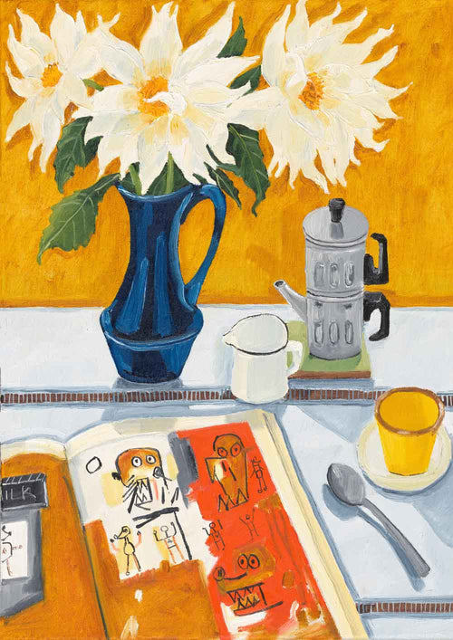 This sophisticated still life features a bouquet of white dahlias in a deep blue vase set against a rich golden background. The scene includes a moka pot, a yellow cup, and an open book displaying Basquiat sketches. The warm and cool tones blend harmoniously, creating a balanced and serene composition. Melanie likes to start her mornings with coffee while flicking through one of her favourite art books before heading to the easel. On this day, her artist of choice was Jean Michel Basquiat.