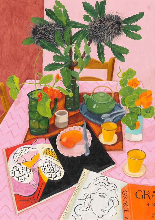 This whimsical still life features a vibrant arrangement of native flowers, a green teapot, and a mango against a pink and red background. The scene includes a stack of art books and a cup of tea, creating a cosy and imaginative setting perfect for daydreaming. Painted in her Sydney studio at the onset of Spring, this painting was inspired by morning tea with a friend and features a beautiful Banksia branch, nasturtium flowers and some of Melanie's favourite books.